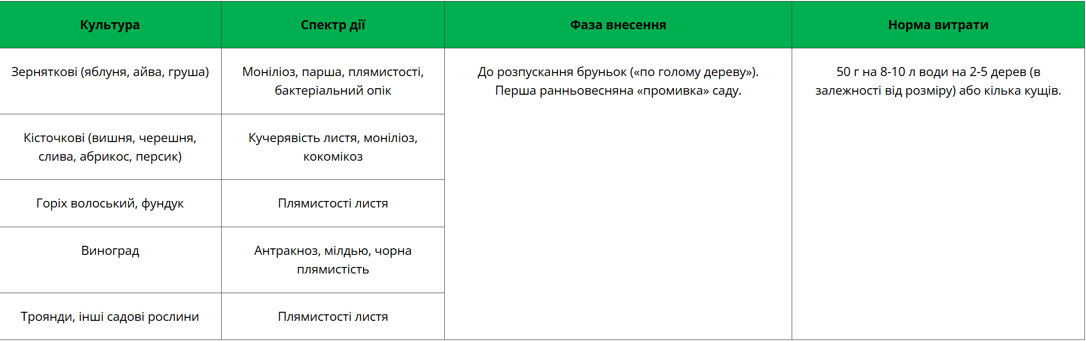 Спектр дії: моніліоз, парша, плямистості, бактеріальний опік, кучерявість листя, кокомікоз, антракноз, мілдью, чорна плямистість.