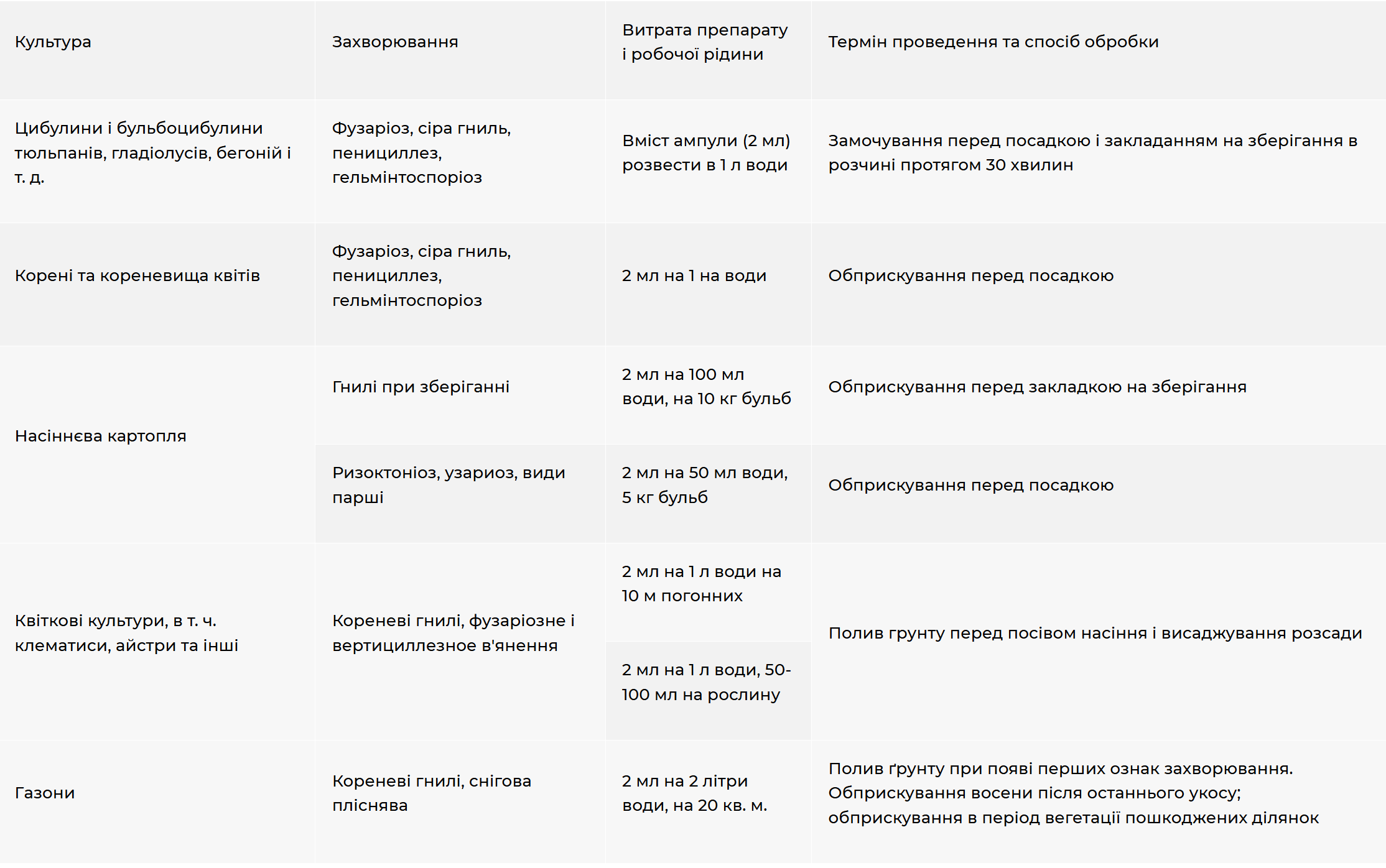 Фунгіцид/протруювач для захисту квіткових культур, насіннєвої картоплі, газонів від хвороб, а також для дезінфекції ґрунту.