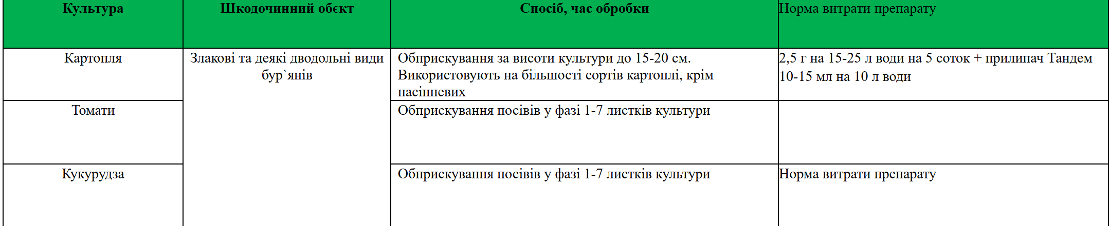 Перед проведенням обприскування необхідно розрахункову кількість препарату (див. табл.) розчинити у чистій воді та ретельно перемішати. Робочий розчин використати в день його приготування, оскільки при довготривалому зберіганні втрачаються властивості препарату, що призводить до зниження ефективності дії проти бур'янів. Обробку проводити за сприятливих погодних умов (відсутність поривчастого вітру, температура повітря не вище +250С, відсутність роси), зазвичай це ранкові (до 10-11) та вечірні (18-22) години. Обприскування необхідно проводити в період початку росту бур'янів (сім'ядолі-дві пари справжніх листочків у дводольних, у однорічних злакових 2-4 листочки, багаторічні злакові за висоти до 10-15 см). Не рекомендується застосування препарату за несприятливих умов (у холодну або дуже жарку погоду, при надмірному зволоженні і в період, коли бур'яни знаходяться в пригніченому стані), а також коли рослини мокрі після випадання опадів. Доцільним є використання в суміші з фунгіцидами Цілитель або Захист. Максимальна кратність обробок за сезон – 1. Строк виходу людей на оброблені площі для проведення ручних робіт – 7 днів, механізованих робіт – 3 доби (томати, картопля), кукурудза – не потребує. Строк очікування від обробки до збору врожаю — не регламентується.