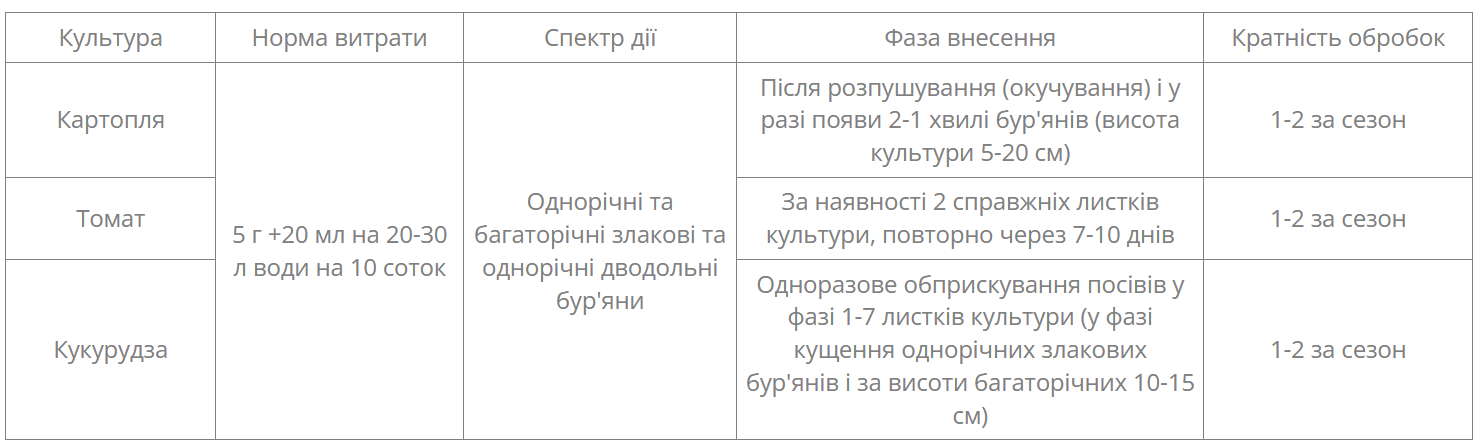 - после лестничного внесения позволяет уничтожить одним опрыскиванием широкий спектр злаковых и двудольных сорняков;