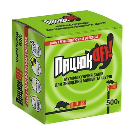 Пацюк Офф— зерновая приманка (арахис и сыр) для уничтожения мышевидных грызунов (мышей, крыс) в условиях быта. Средство действенное даже в случае резистентности (привыкания) грызунов к другим приманкам. Мыши и крысы с легкостью приманиваются особенными веществами, которые имеются в средстве, и погибают на протяжении 3–7 дней после съедания средства. Процесс отравления грызунов не вызывает беспокойство у других мышевидных, грызуны погибают в открытом пространстве, в результате удушья.