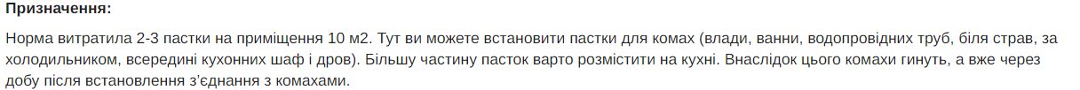 В комплект входят 6 приманок, которые распаковываются в местах, где появляются насекомые. Рисование клейкой лентой на оборотной стороне ловушек позволяет размещать их как на горных, так и на вертикальных поверхностях. Исчезновение тараканов и муравьев начинается уже через несколько часов после контакта со средством. После исчезновения насекомых рекомендуется профилактически применять ловушки 1 раз в 3-4 месяца во избежание повторного возникновения насекомых от соседей.